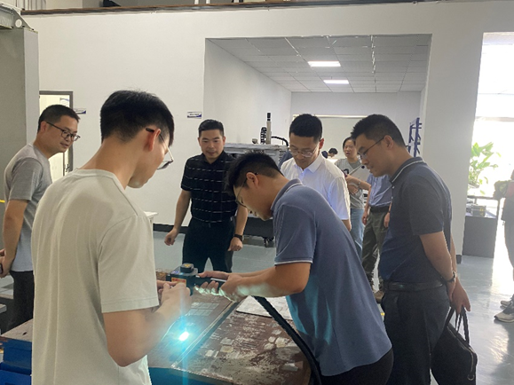 8月11日,钱塘区经信科技局卢建军局长一行莅临中数智科考察。领导一行参观了公司生产实验中心及自主研发的系列化激光清洗设备、车载轨道综合检测系统等,现场除锈展示中,设备高效精准完成作业,尽显企业作为专精特新小巨人将人工智能与实体产业深度融合的实力。